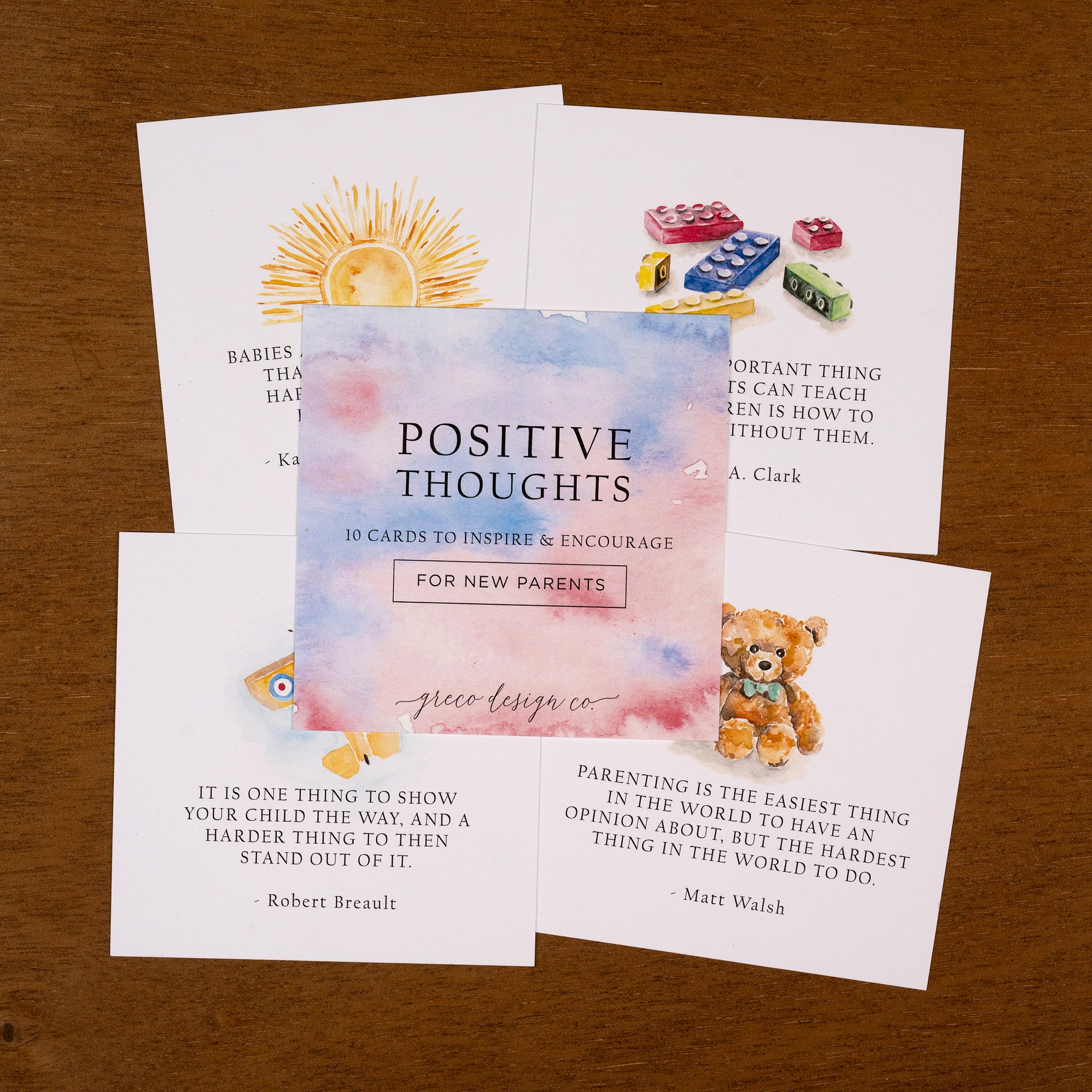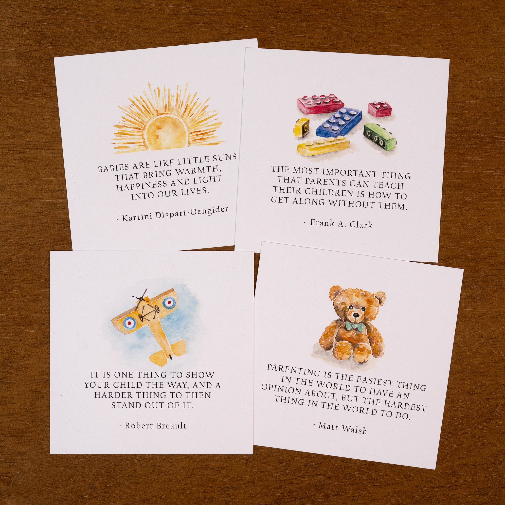 These 4x4" card sets were all created to bring a little positivity and inspiration to our daily lives. This New Parents Set contains 10 cards, each featuring an original watercolor painting my Lori with an inspirational quote. They make wonderful gifts for anyone needing a little positivity (isn't that all of us?). They fit in a 4x4" frame or in one of my handmade wood holders specifically create for these card sets. Be sure to check them out in the home decor section.
