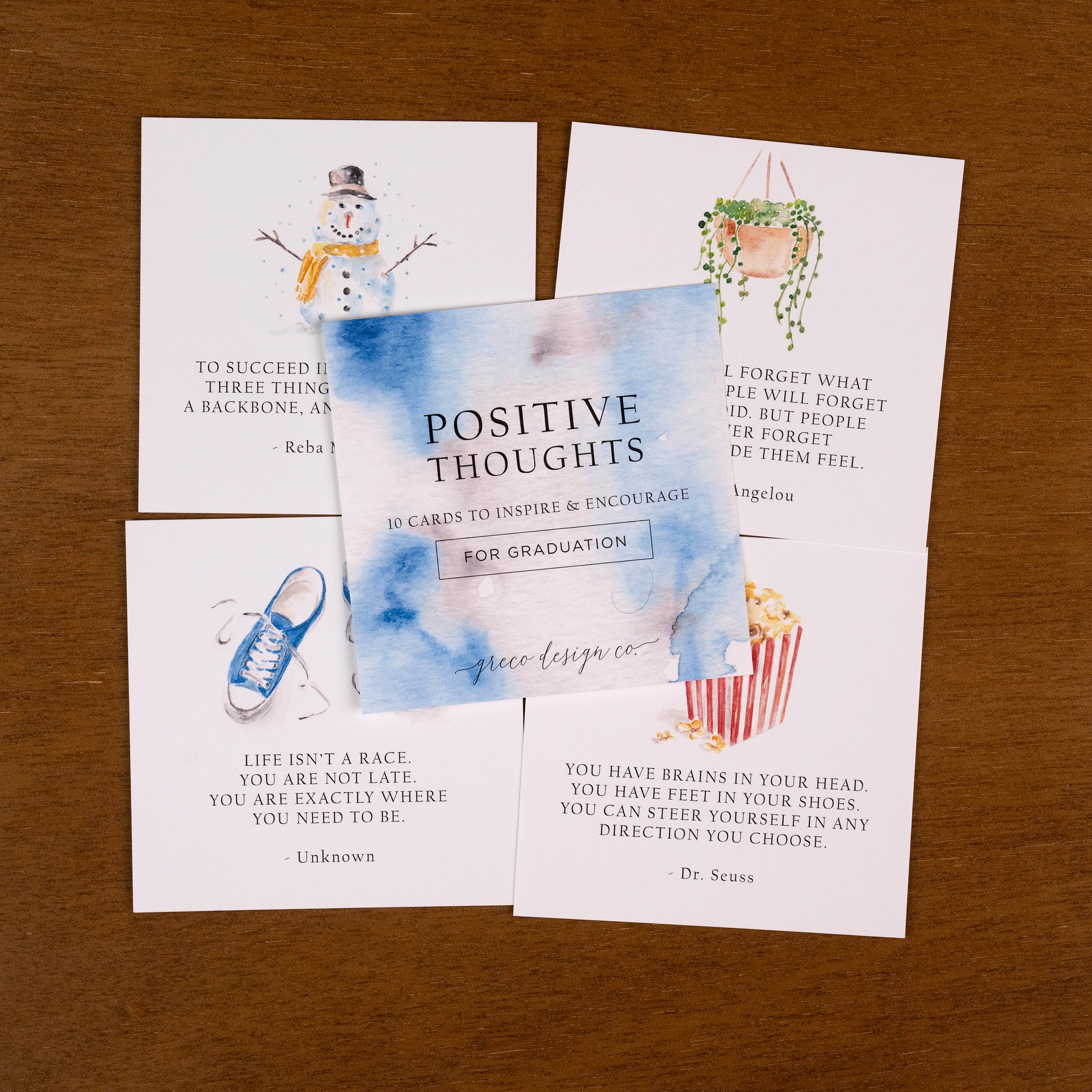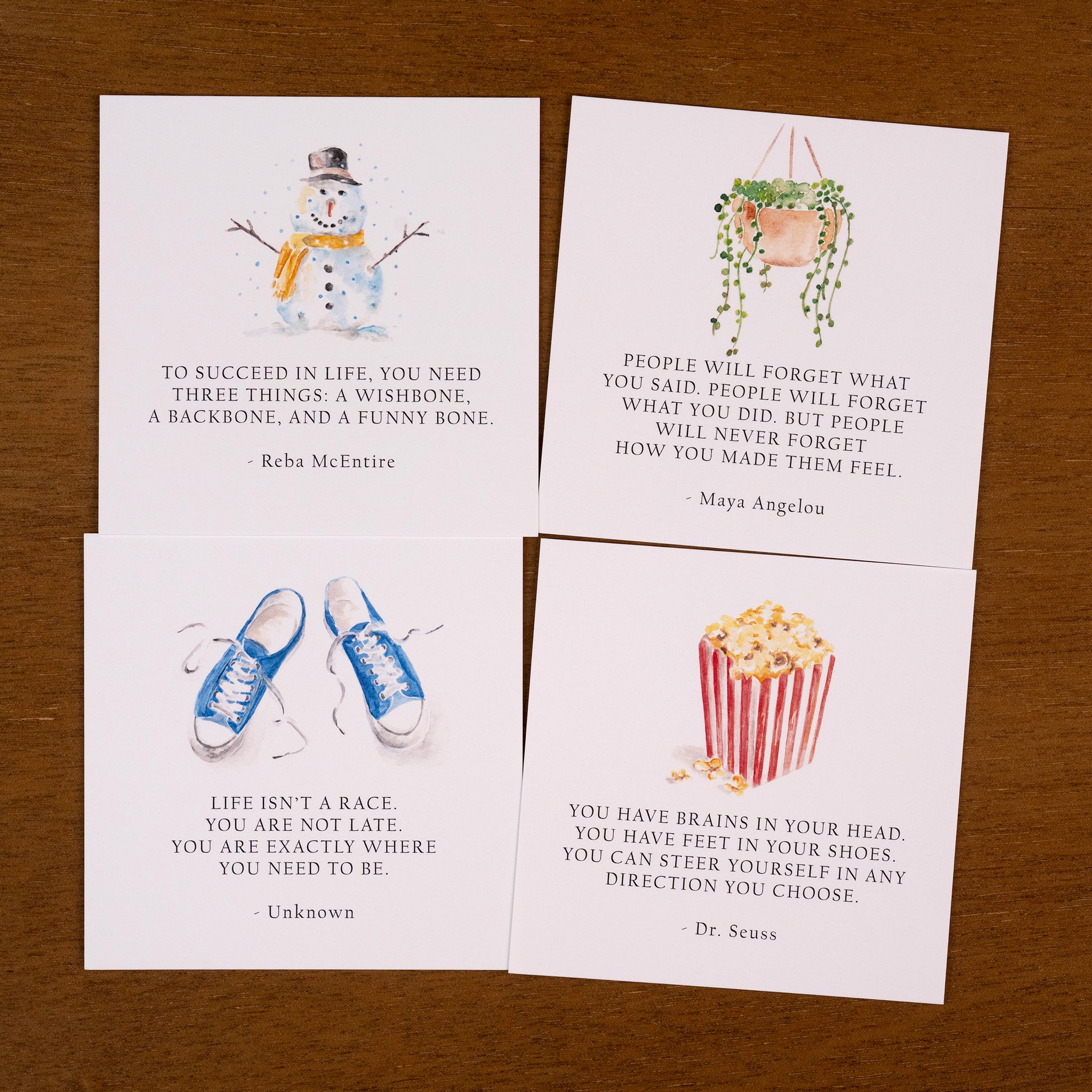 9These 4x4" card sets were all created to bring a little positivity and inspiration to our daily lives. This Graduation Set contains 10 cards, each featuring an original watercolor painting my Lori with an inspirational quote. They make wonderful gifts for anyone needing a little positivity (isn't that all of us?). They fit in a 4x4" frame or in one of my handmade wood holders specifically create for these card sets. Be sure to check them out in the home decor section.