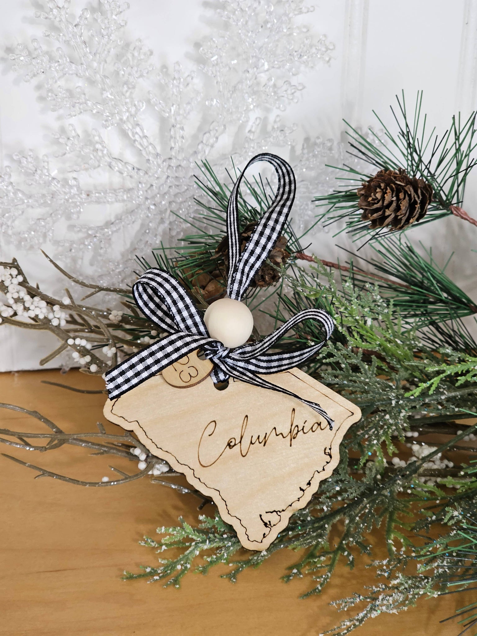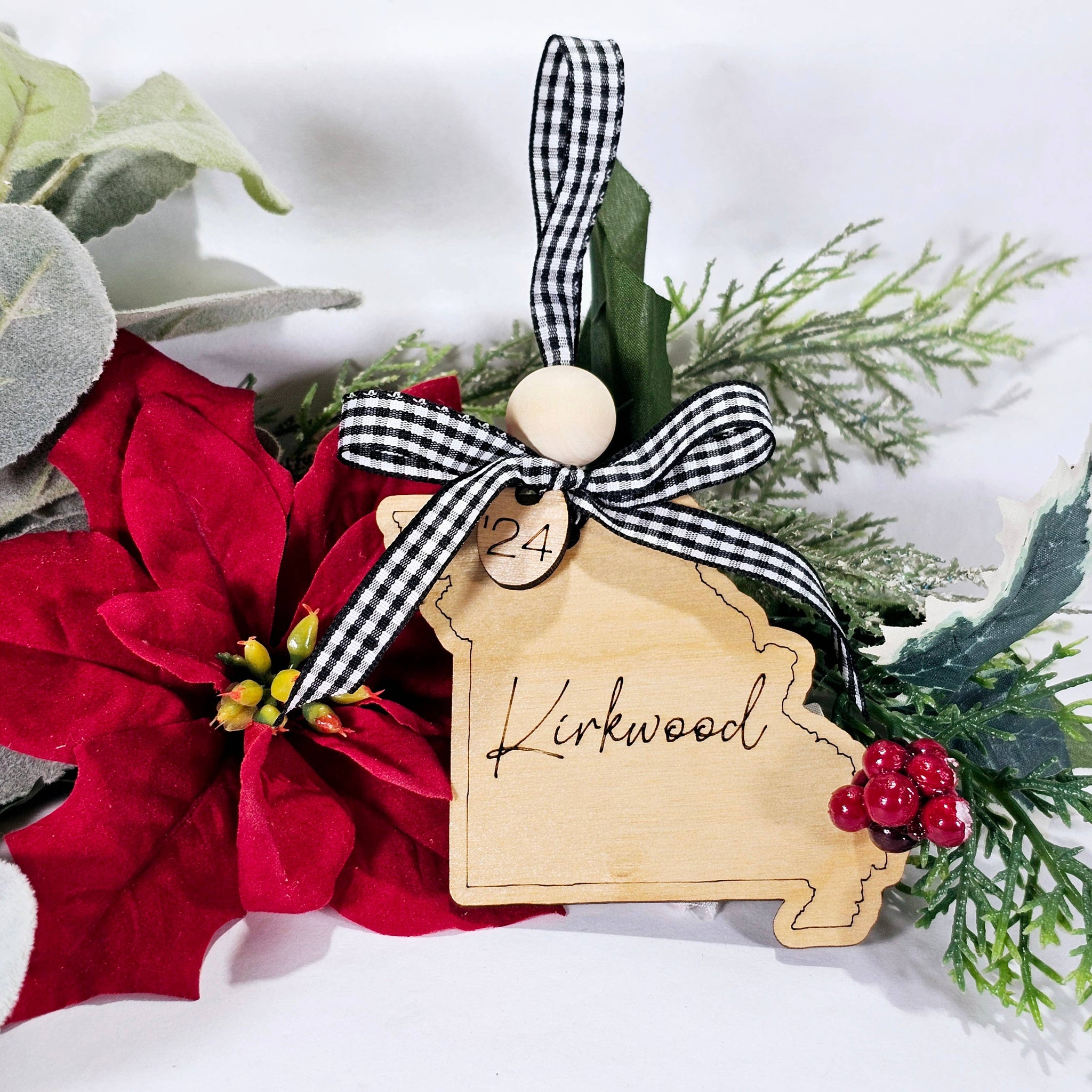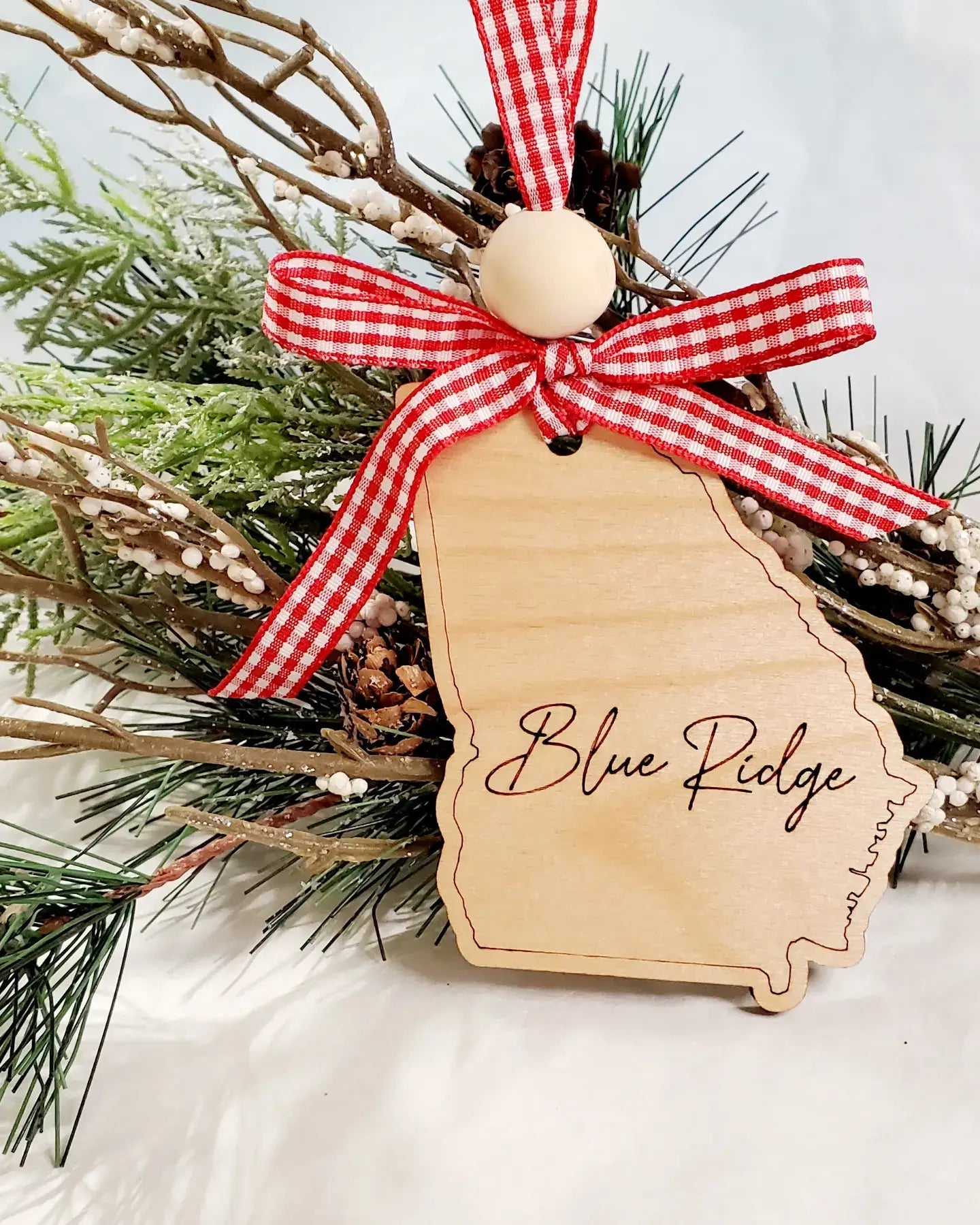 What a thoughtful item to have in your shop or boutique, a Custom Town or local school name engraved on the shape of your state, Christmas ornament? Approximately 4" A wooden bead is a great touch and this ornament is perfect to keep year around as a keepsake and souvenir items. Realtors & tourists love them to add with closing gifts as well.