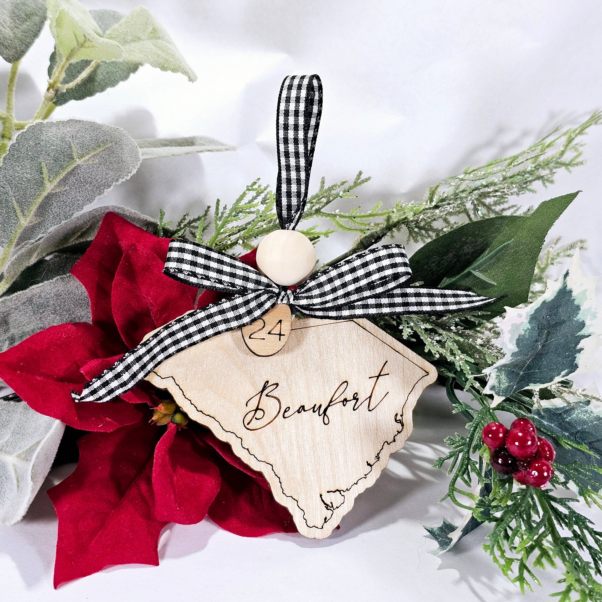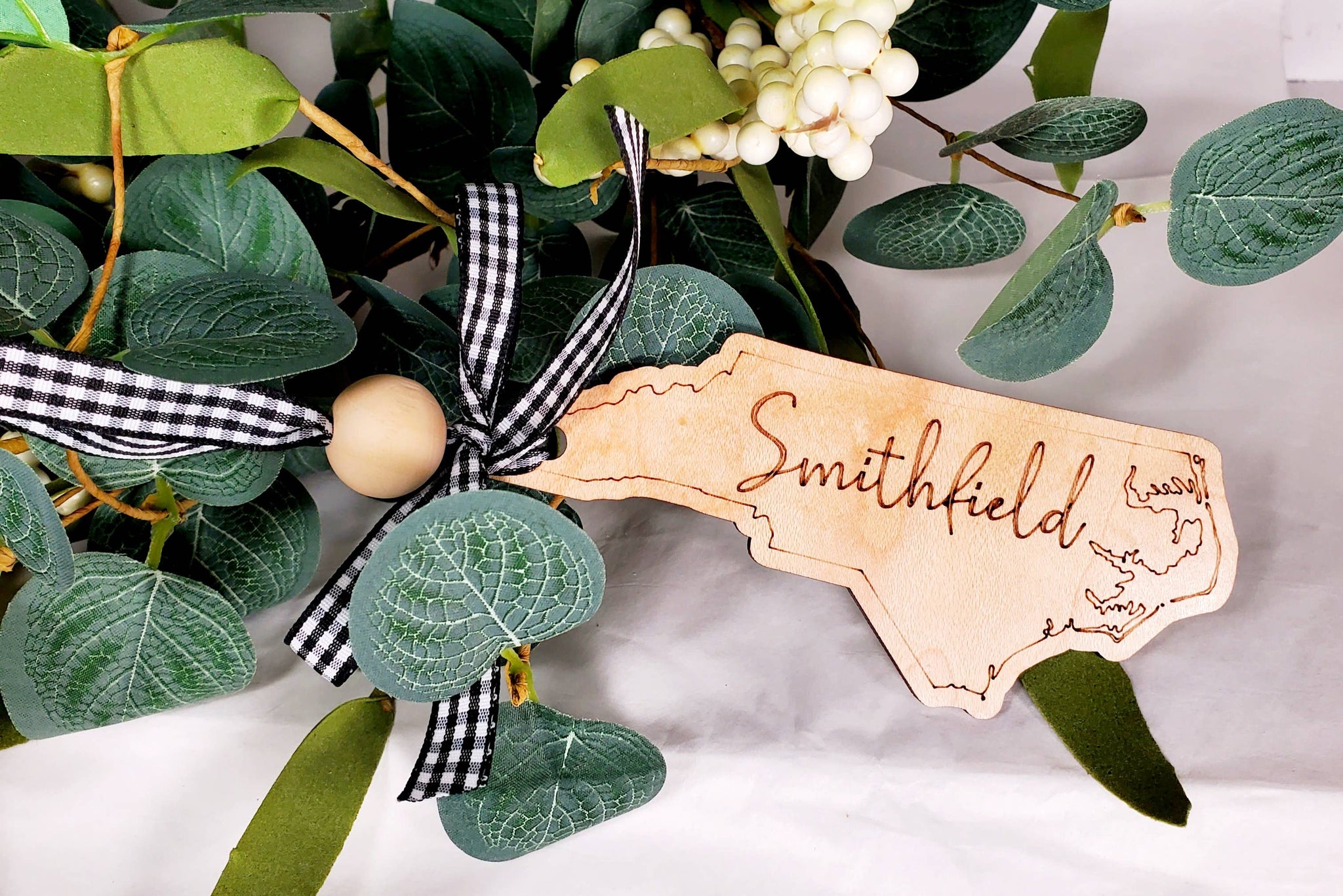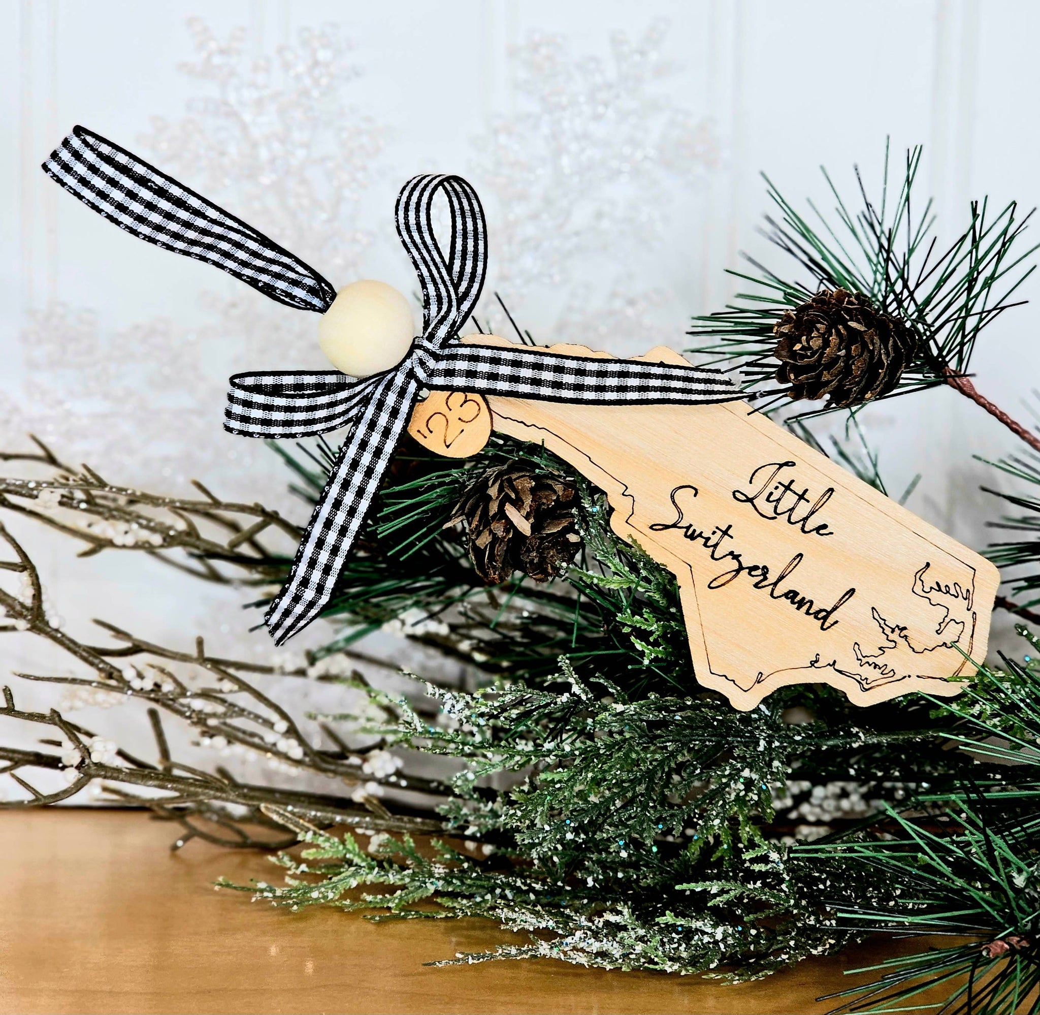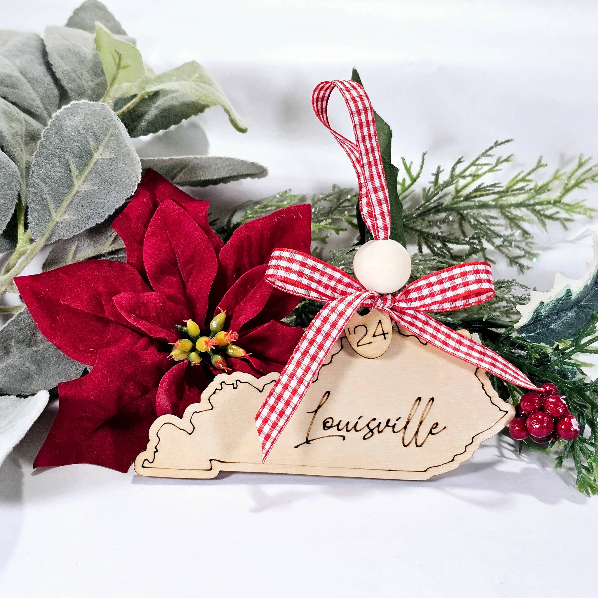 What a thoughtful item to have in your shop or boutique, a Custom Town or local school name engraved on the shape of your state, Christmas ornament? Approximately 4" A wooden bead is a great touch and this ornament is perfect to keep year around as a keepsake and souvenir items. Realtors & tourists love them to add with closing gifts as well.