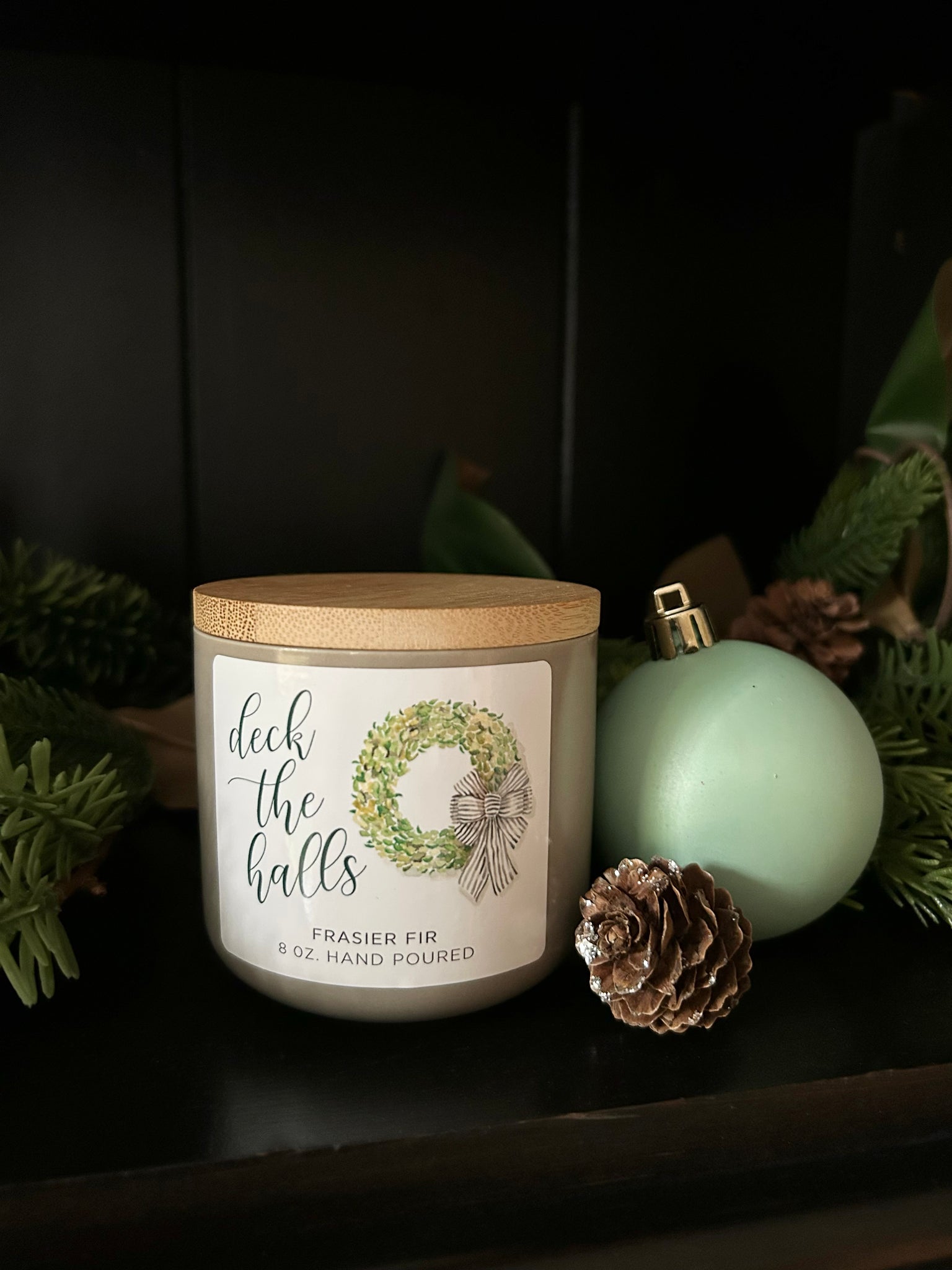 These candles were handpicked by us and Lori designed the labels - each featuring her watercolor art. The beautiful ceramic vessels each have a bamboo lid. They make beautiful gifts for all. Deck the Halls is in a gray vessel and features Lori's watercolor wreath with a black and white striped bow. It smells like a real Frasier Fir tree! Candles are 8oz and are 100% soy.