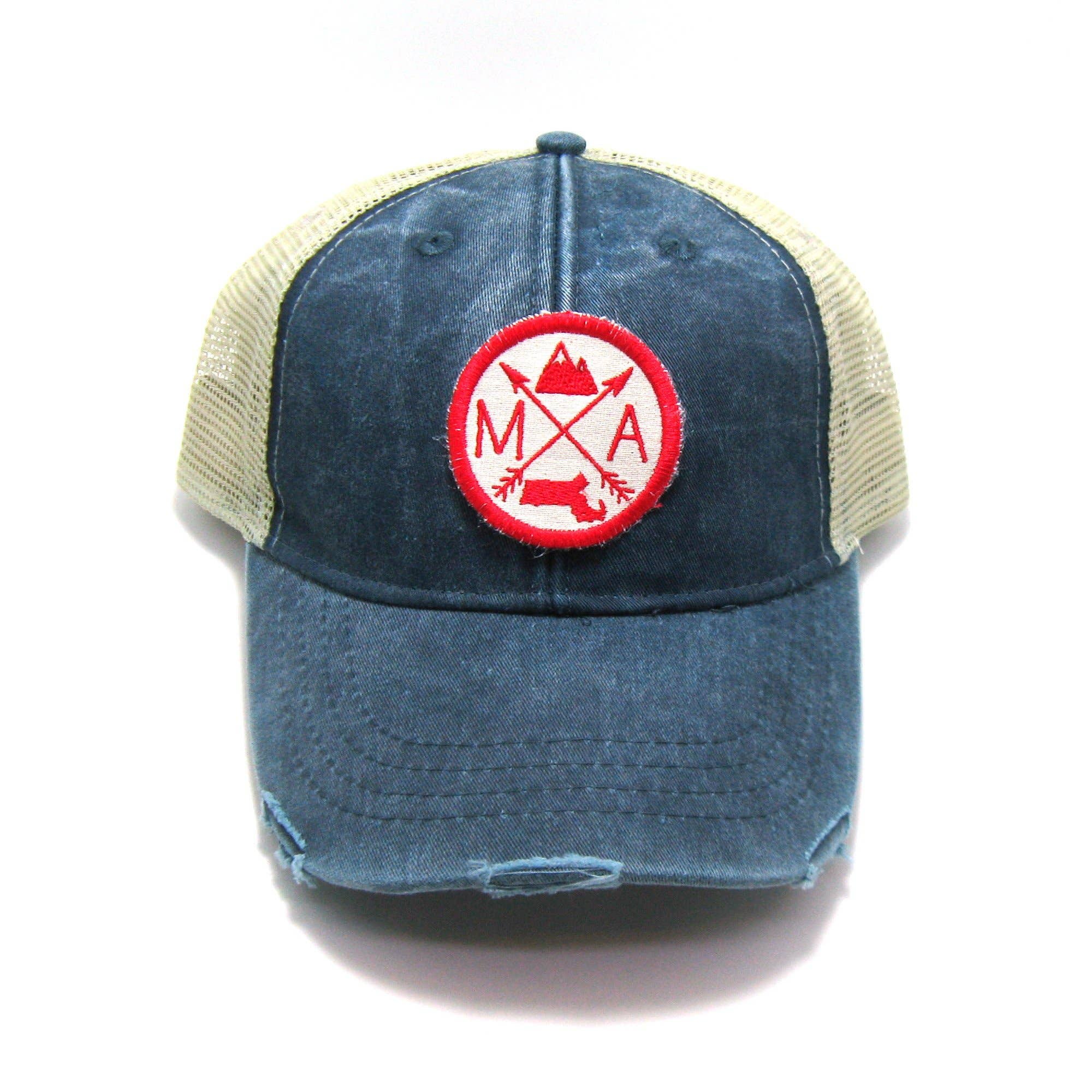 We took some great, mesh backed, distressed trucker hats and embroidered a modern Arrows design on the front. The hats have a snapback closure on the back. The fit of the hat is mid-profile. It is adjustable with the snapback.